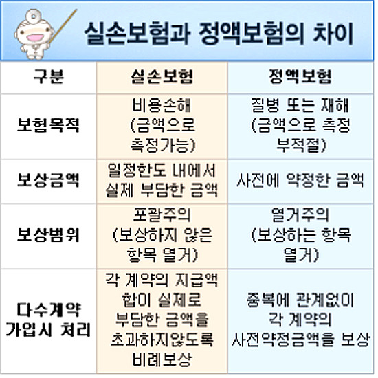 실손보험은 정액보험과 비교할 때, 보상 방식이 다릅니다. 정액보험은 특정 조건에 따라 정해진 금액을 지급하는 반면, 실손보험은 실제 발생한 비용을 기준으로 보상합니다. 따라서 실손보험은 더 많은 의료비를 보장받을 수 있는 장점이 있습니다.