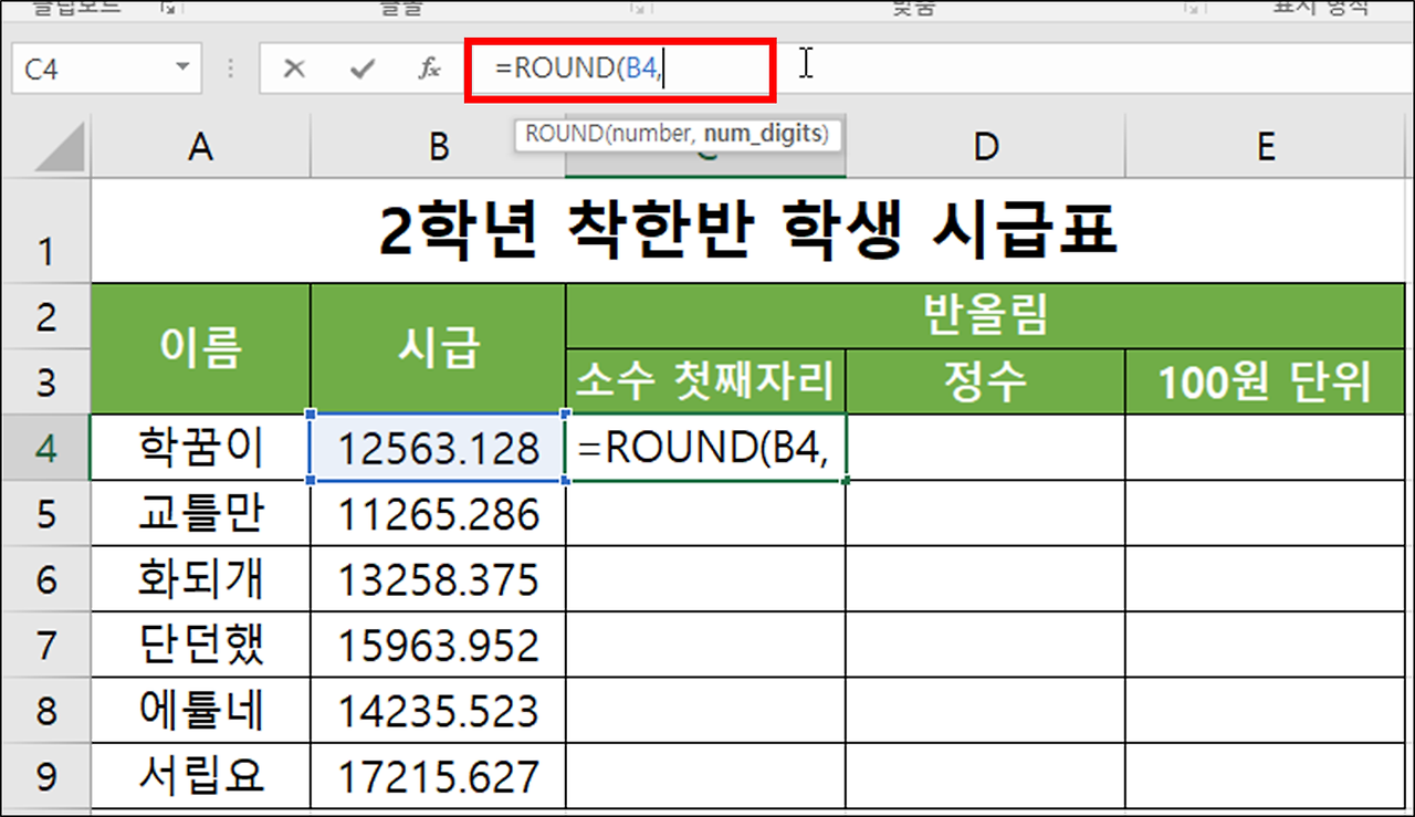 - 자릿수 : 몇 자리로 반올림할 것인지 지정해요. 양수면 소수점 오른쪽, 음수면 소수점 왼쪽을 의미해요.