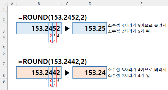 예를 들어, =ROUND(153.2452, 2)라고 입력하면, 결과는 153.25가 돼요. 왜냐하면 소수점 두 번째 자리(4)는 세 번째 자리(5) 때문에 올림이 되기 때문이죠.