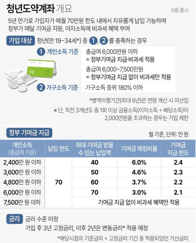 청년도약계좌에 가입하기 위해서는 몇 가지 조건이 있습니다. 우선, 가입자는 19세에서 34세 사이의 청년이어야 하며, 개인 소득이 일정 기준 이하이어야 합니다. 예를 들어, 연소득이 6천만 원 이하인 경우 정부의 지원을 받을 수 있습니다. 또한, 가입자는 매월 최소 7만 원 이상을 저축해야 하며, 최대 70만 원까지 저축할 수 있습니다.