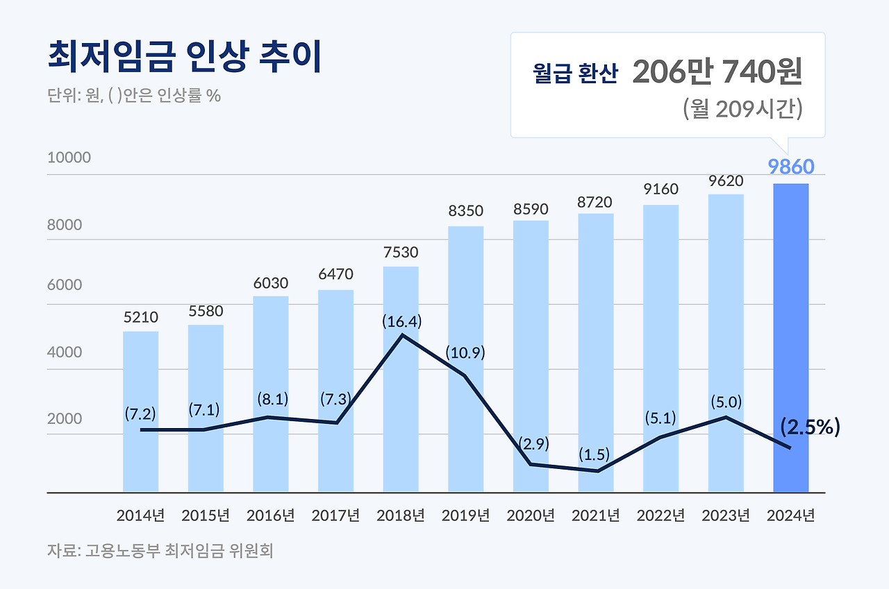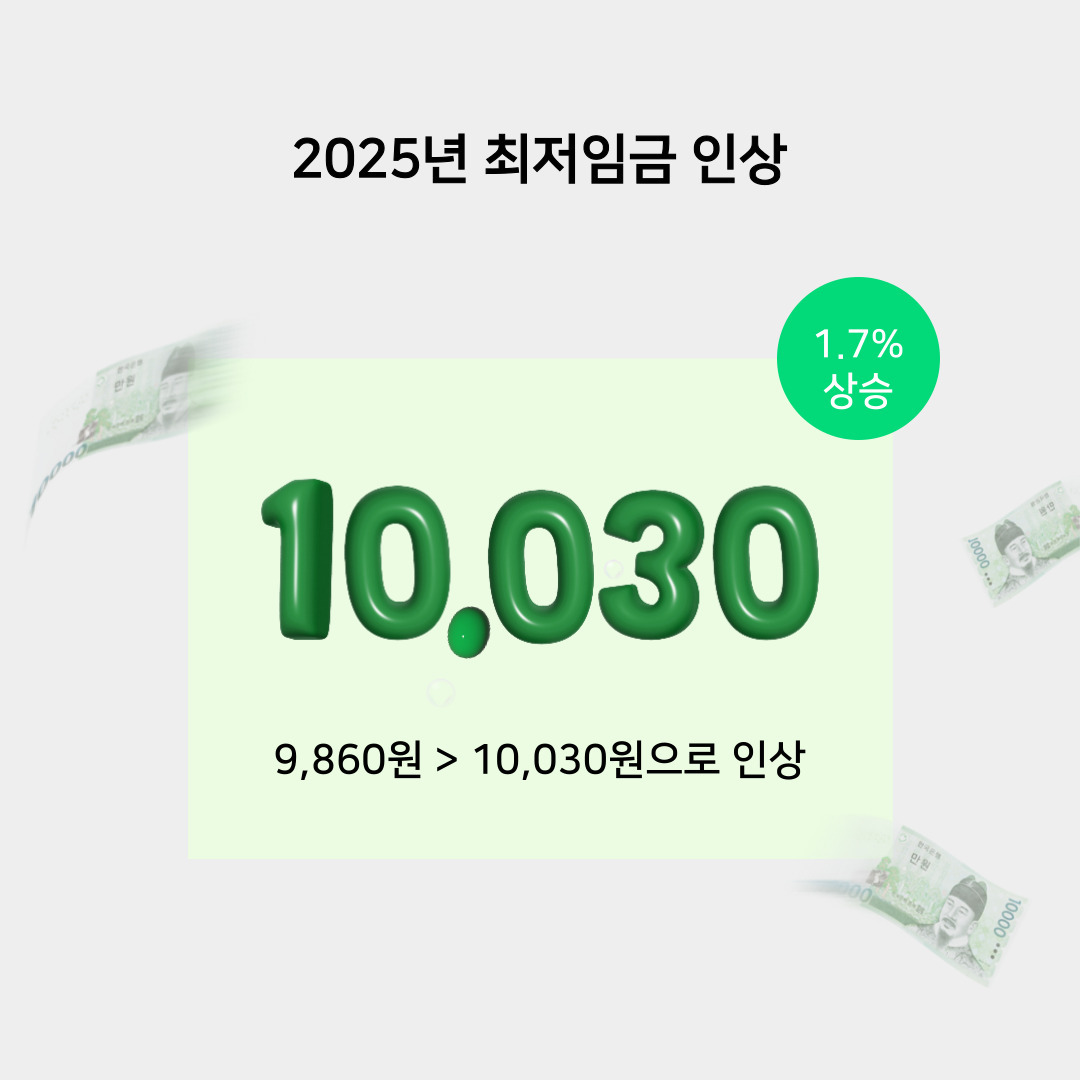 2025년 최저임금은 10,030원으로, 이는 2024년의 9,860원에서 1.7% 인상된 것입니다. 이 인상은 근로자들에게는 긍정적인 소식이지만, 사업주들에게는 추가적인 부담이 될 수 있습니다.