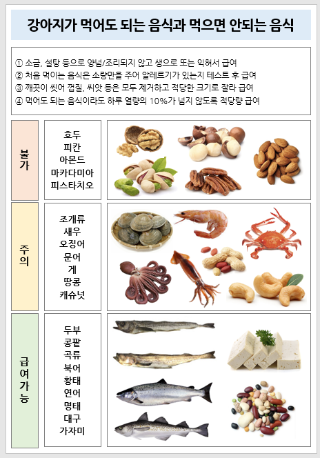 - 해산물 : 조개, 새우 등은 알레르기를 유발할 수 있으므로, 처음 주기 전에 소량으로 테스트해보는 것이 좋습니다.