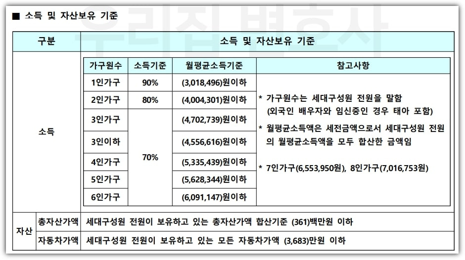 소득 기준은 가구원 수에 따라 다르게 설정되어 있습니다. 예를 들어, 1인 가구는 월 평균 소득의 70% 이하, 2인 가구는 50% 이하가 되어야 합니다. 아래 이미지는 소득 기준에 대해 구체적으로 정리된 표입니다.