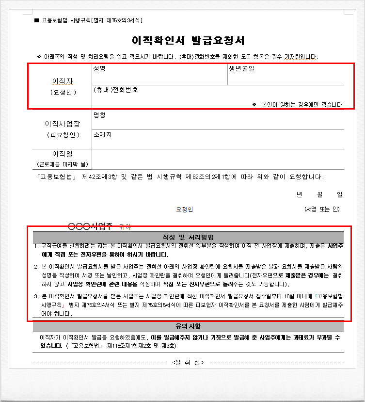 1. 발급 요청서 작성 : 이직확인서 발급 요청서를 작성해야 합니다. 이 요청서에는 개인 정보와 발급 사유를 기재해야 합니다.