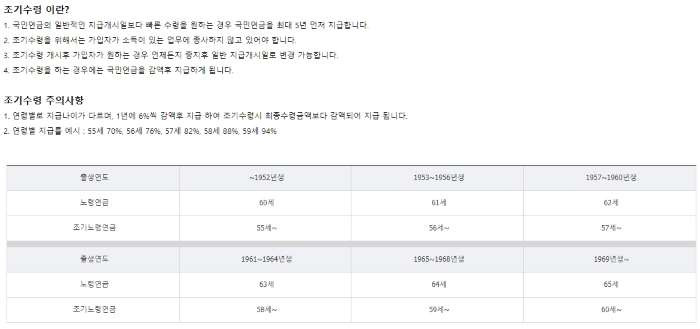 - 신청 연령 : 조기수령은 본인이 신청할 수 있으며, 지급 개시 연령보다 최대 5년 일찍 받을 수 있습니다. 이 조건은 개인의 생년월일에 따라 다를 수 있습니다.