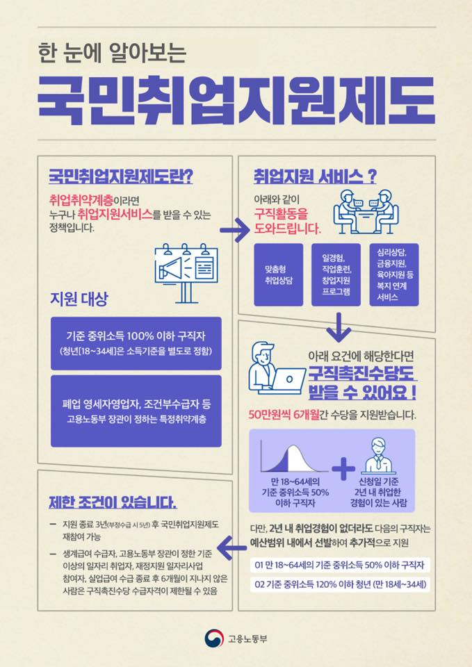 국민취업지원제도는 취업을 원하는 모든 사람들에게 필요한 다양한 서비스를 제공하는 제도입니다. 이 제도의 목적은 구직자들이 적합한 일자리를 찾을 수 있도록 지원하고, 저소득층 구직자들에겐 생계 안정도 함께 도모하는 것입니다. 지금부터 이 제도의 구체적인 내용들을 알아보도록 하겠습니다.