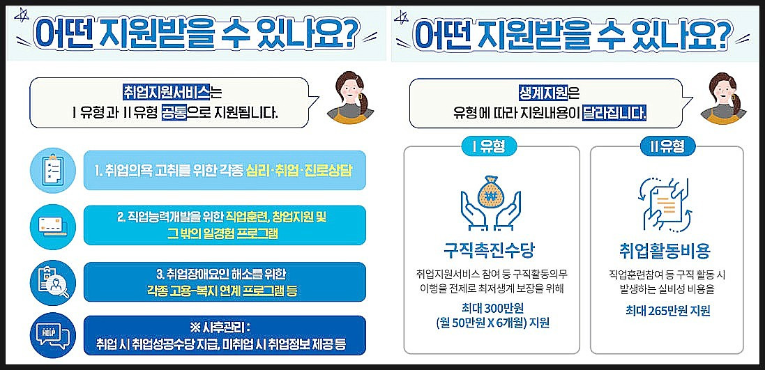 - Type I 지원 : 주로 취업 상담과 다양한 직무 교육 프로그램이 포함되며, 최대 30만 원의 재정적 지원이 가능합니다.