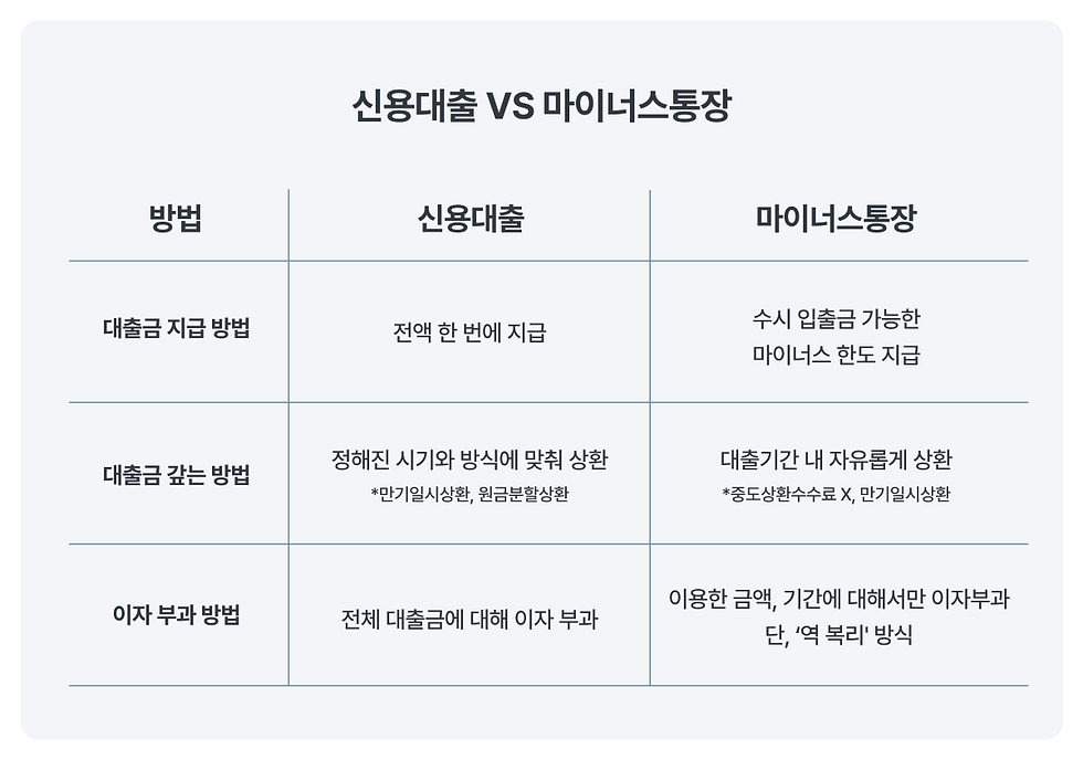 마이너스통장은 자주 자금을 인출해야 하는 분들에게 적합하며, 신용대출은 한 번에 큰 금액이 필요할 때 유리합니다. 개인의 재정 상황과 필요에 따라 적절한 대출 상품을 선택하는 것이 중요합니다.