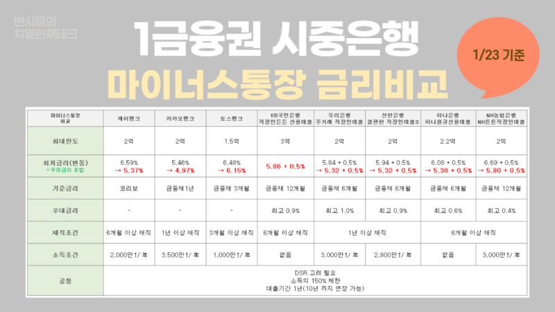 아래 표는 한국의 주요 은행들이 제공하는 마이너스통장과 신용대출의 평균 이자율을 비교한 것입니다.