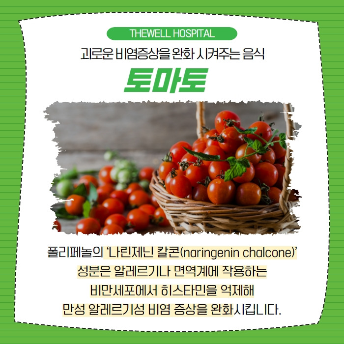 - 토마토 : 토마토에는 비타민 C가 풍부하여 면역력을 높여줍니다. 또한, 항염 작용이 있어 비염 증상 완화에 도움이 됩니다.