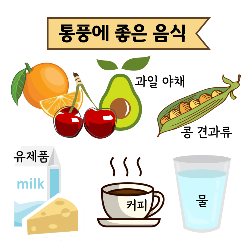 반면, 통풍에 좋은 음식도 있습니다. 이러한 음식들은 요산 수치를 낮추고 염증을 줄이는 데 도움을 줍니다. 통풍에 좋은 음식으로는 다음과 같은 것들이 있습니다: