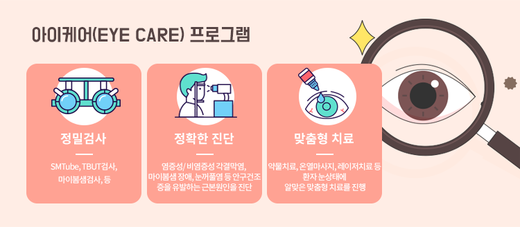- 눈꺼풀 위생 관리 : 눈꺼풀의 청결을 유지하여 마이봄샘 기능을 개선합니다.