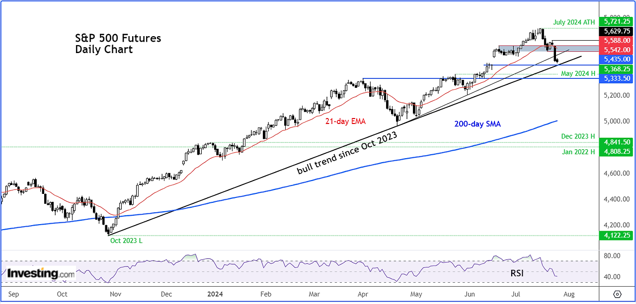 S&P 500 지수의 기술적 분석은 투자자들이 시장의 추세를 파악하고, 매매 시점을 결정하는 데 도움을 줍니다. 아래의 차트는 S&P 500 선물의 일일 차트를 보여줍니다. 이 차트에서는 2023년 10월 이후의 상승 추세선과 21일 지수 이동 평균선(EMA), 200일 단순 이동 평균선(SMA)을 확인할 수 있습니다.