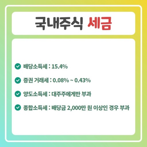 #국내주식 #세금 #배당소득세 #양도소득세 #증권거래세 #세금절세 #주식투자 #국세청 #투자정보