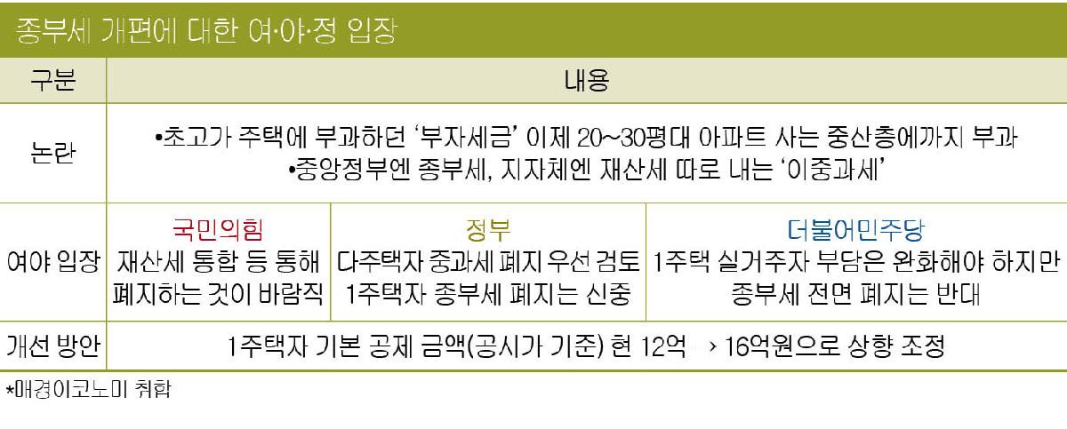최근 종부세에 대한 논란이 일고 있습니다. 많은 국민들이 종부세가 중산층에게 큰 부담이 된다고 주장하고 있습니다. 특히 작은 아파트를 소유한 사람들 사이에서 불만이 커지고 있습니다. 이에 대한 정부의 개선 방안으로는 종부세의 기본 공제액을 1.2억 원에서 1.6억 원으로 상향 조정하는 것을 고려하고 있습니다.