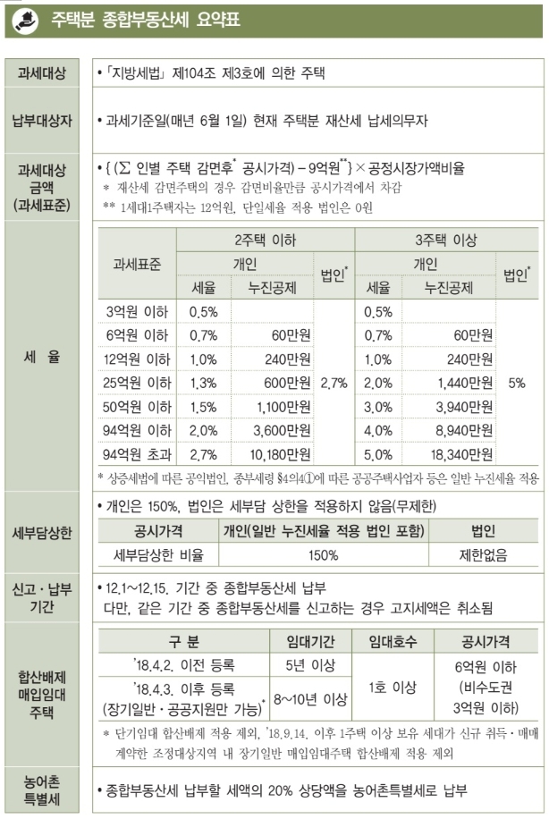 [1] 국세청 - 2024년 종합부동산세 요약표('24.9.19.현재) (https://www.nts.go.kr/comm/nttFileDownload.do?fileKey=701a1be40cbf40aa75735774eddf1f95)