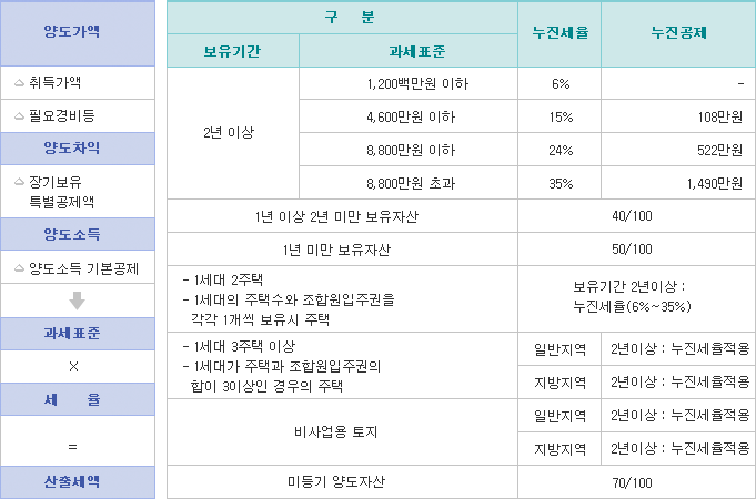 • 세율 : 양도소득세는 누진세율로 적용됩니다.