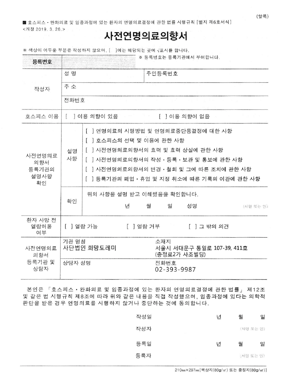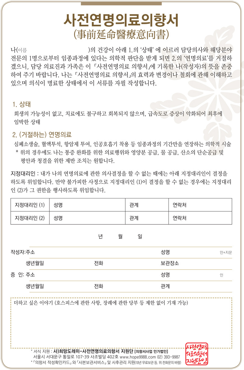 [1] 국립연명의료관리기관 - 작성 시 유의사항 > 사전연명의료의향서 (https://www.lst.go.kr/addt/attentionpoint.do)