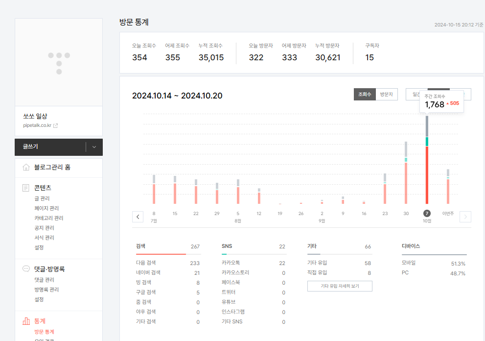 주간 조회수는 1768 !!! 저번주 보다 늘었다 근데 여전히 다음 검색 유입으로만 먹고 살고있는듯.
