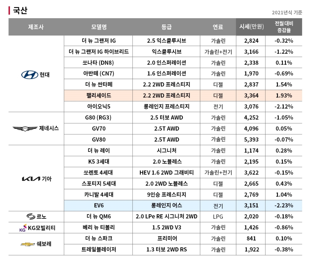 | 현대 | 팰리세이드 | 4,000 | 가솔린 | +1.93 |