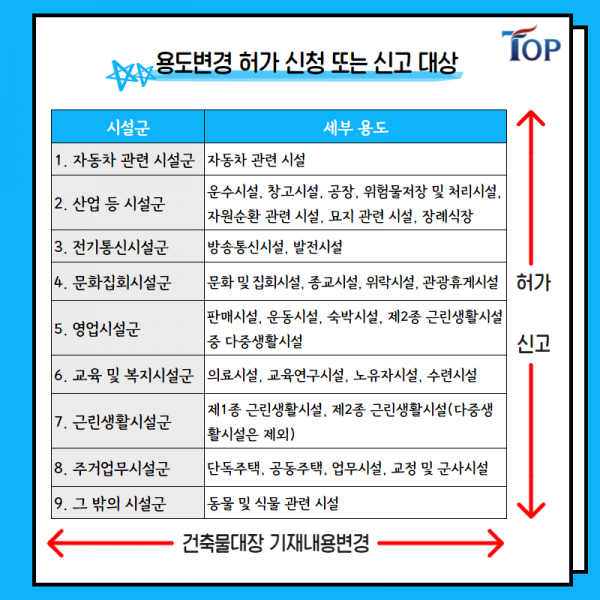 - 용도변경 가능성 확인 : 변경하고자 하는 용도가 허가 대상인지, 신고 대상인지 확인합니다.