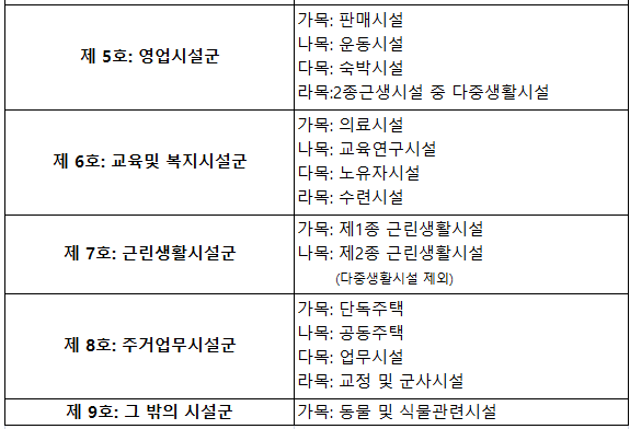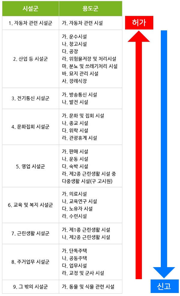 에서는 시설군과 용도군에 따른 허가 및 신고 절차를 정리한 표를 확인할 수 있습니다.