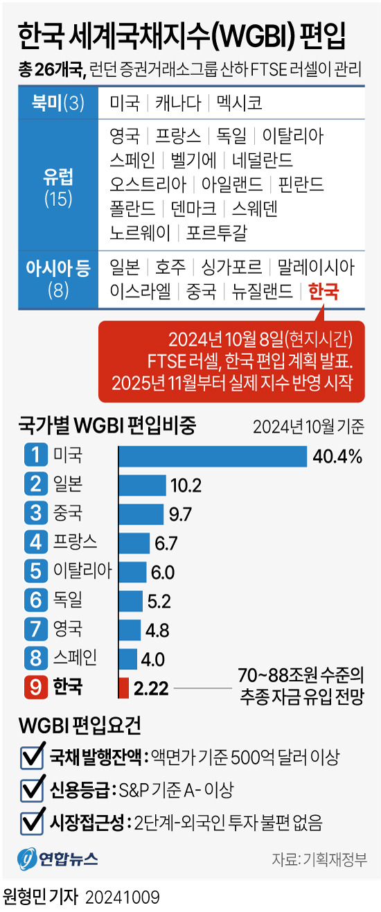 [4] 연합뉴스TV - 한국, 세계국채지수 편입…75조 해외자금 들어온다 (https://m.yonhapnewstv.co.kr/news/MYH20241009012800641)