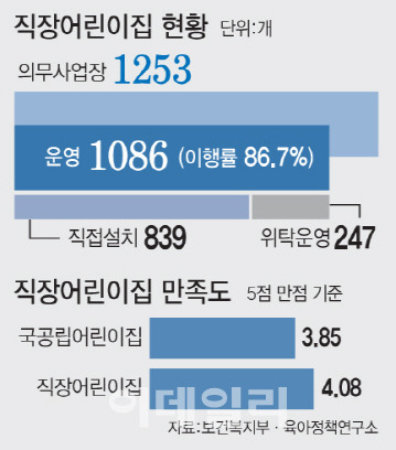 현재 한국에는 총 1,253개의 직장어린이집이 있으며, 그 중 1,086개가 운영되고 있습니다. 운영률은 86.7%로, 이 중 839개는 직접 운영되는 어린이집이고, 247개는 특별 운영 어린이집입니다. 직장어린이집의 만족도는 평균 4.08로, 공공 어린이집의 3.85보다 높은 수치를 기록하고 있습니다.