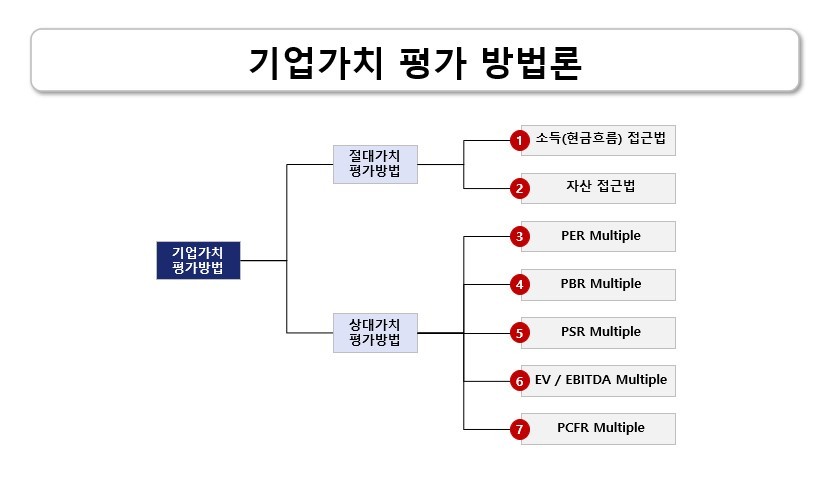 을 통해 이러한 두 가지 방법론의 구조를 살펴볼 수 있습니다. 절대가치 평가방법으로는 수익 접근법과 자산 접근법이 있으며, 상대가치 평가방법으로는 PER, PBR, PSR와 같은 다양한 배수를 사용합니다.