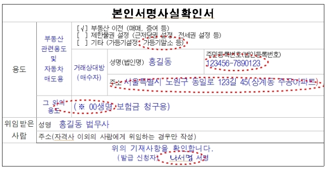- 신청서 작성 : 본인서명사실확인서 신청서를 작성합니다. 이때, 개인 정보(이름, 주민등록번호, 주소 등)를 정확히 기입해야 합니다.