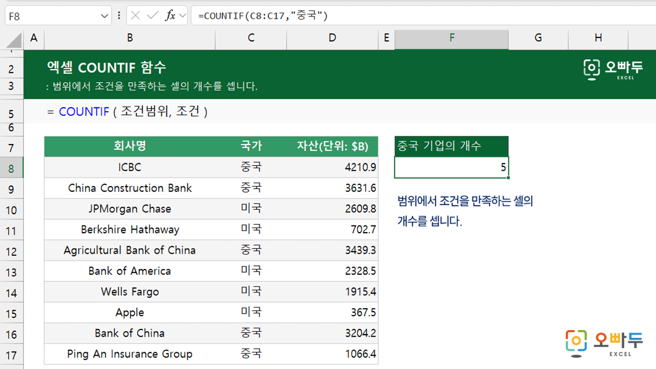 COUNTIF 함수는 특정 조건을 만족하는 셀의 개수를 세는 데 사용됩니다. 사용법은 다음과 같습니다: