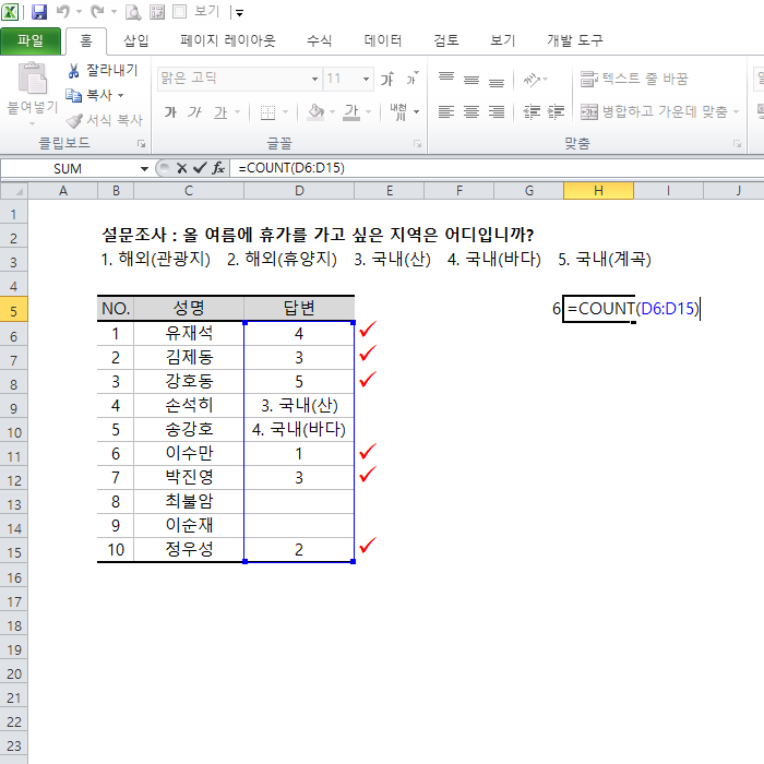 실제 예제를 통해 COUNT 함수를 더 잘 이해해 보겠습니다. 아래의 표는 여름 휴가를 어디로 가고 싶은지에 대한 설문조사 결과입니다.