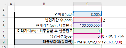- 이자율 : 예를 들어, 연 이자율이 3.5%이면, 월 이자율은 3.5%/12로 입력합니다.