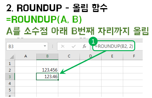 =ROUNDUP(123.456, 2) → 결과: 123.46