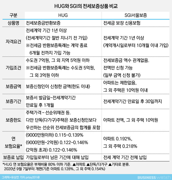 전세보증보험은 여러 종류가 있으며, 각 보험사마다 제공하는 상품이 다릅니다. 대표적으로 HUG와 SGI의 상품을 비교해보면 다음과 같습니다.