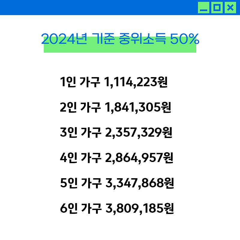 2024년의 기준 중위소득은 가구의 규모에 따라 다르게 설정됩니다. 아래는 2024년의 소득 기준입니다: