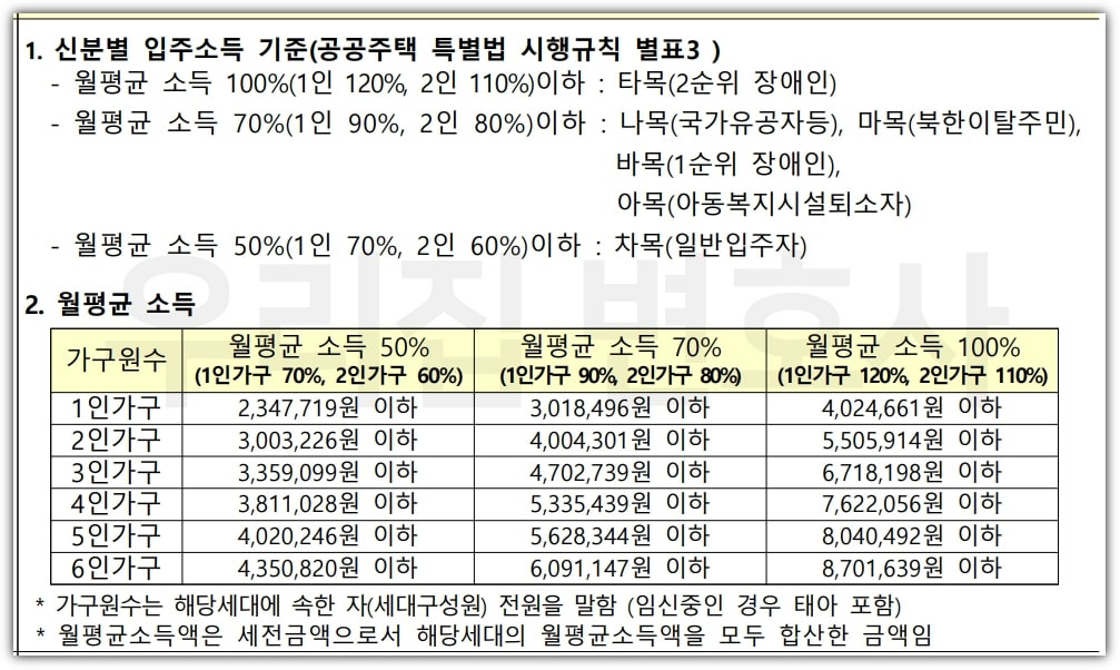 이 표는 가구원 수에 따른 소득 기준을 보여줍니다. 소득 기준은 매년 변동될 수 있으므로, 최신 정보를 확인하는 것이 중요합니다.