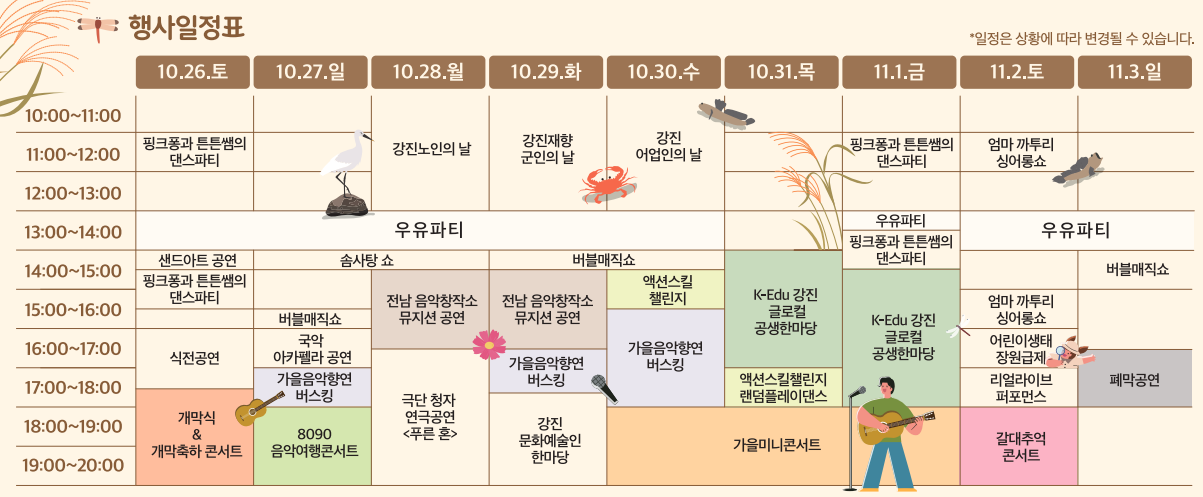2024년 강진만 춤추는 갈대축제는 10월 26일부터 11월 3일까지 진행되며, 매일 다양한 프로그램이 준비되어 있습니다. 특히, "강진인의 날"과 "강진 어민의 날" 같은 특별한 테마의 날이 있어, 지역 주민들이 자부심을 느끼고 참여할 수 있는 기회를 제공합니다.