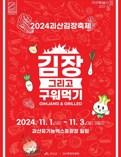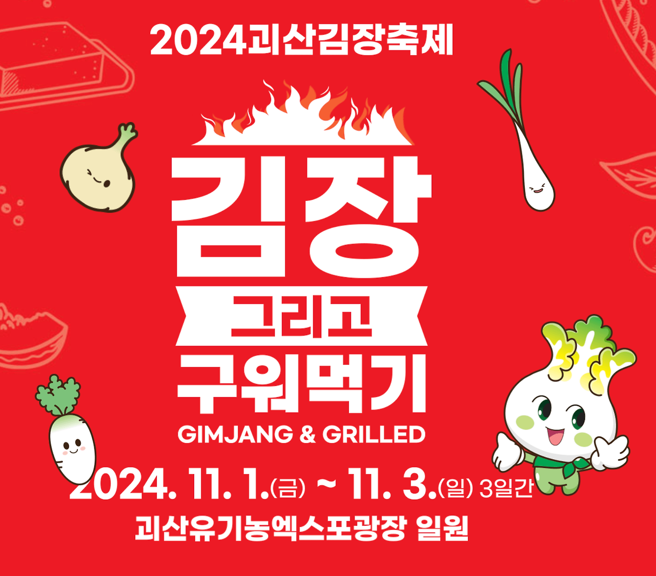2024년 괴산 김장 축제는 11월 1일부터 11월 3일까지 3일간 괴산유기농엑스포광장에서 열립니다. 이곳은 유기농 농산물의 메카로 알려져 있으며, 축제 기간 동안 다양한 농산물과 먹거리를 즐길 수 있습니다.