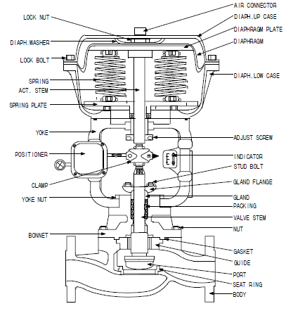 조작부는 다이야프램,스프링,스템으로 이루어져 있다. 밸브 윗부분 (또는 밑부분)으로 공기가 들어오면 다이야프램에 압력이 가해져 스프링을 누른 다. 이때 다이야프램이 움직이면 다이야프램과 Seat와 연결된 스템을 통하여 Seat를 움직이게 하는데, 움직임으로 인하여 유체의 유로를 차단 또는 열리는 정도를 알 수 있도록 지침과 개도/ 레인지 플레이트가 설치 되어 있다.