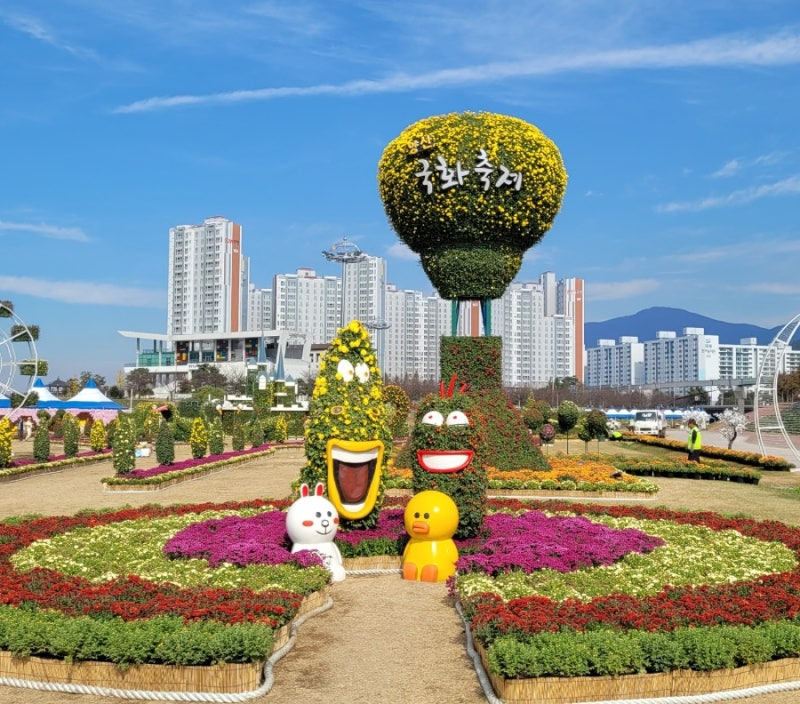 축제 기간 동안 다양한 프로그램이 마련되어 있었어요. 특히, 국화꽃으로 꾸며진 화려한 정원과 조형물들이 인상적이었답니다.