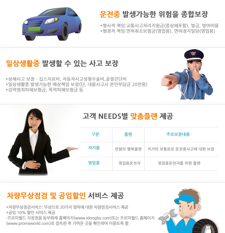 - 교통사고 처리 지원 : 사고 발생 시 최대 3천만 원까지 지원합니다.