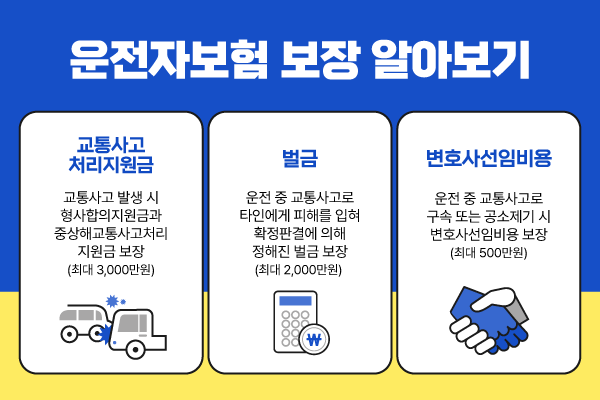 - 법률 비용 지원 : 사고로 인한 법적 비용을 최대 500만 원까지 지원합니다.