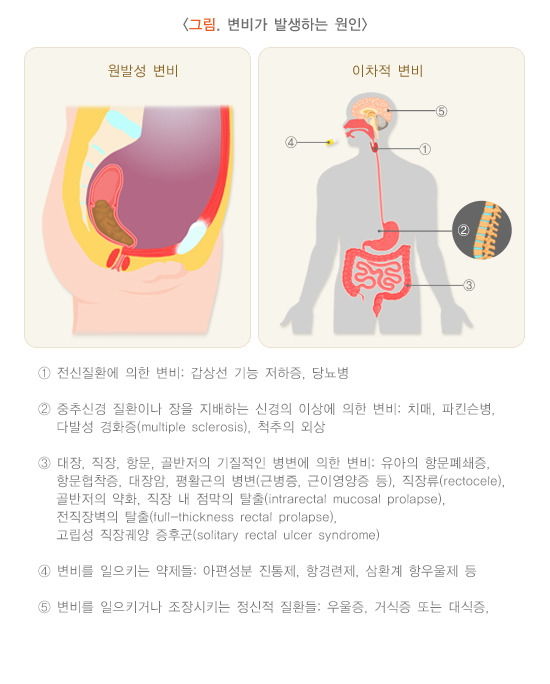 변비의 원인은 크게 두 가지로 나눌 수 있습니다: 원발성 변비와 이차성 변비입니다. 원발성 변비는 특별한 원인 없이 대장이나 직장의 운동 기능 장애로 발생하며, 이차성 변비는 다른 질환이나 약물의 영향으로 발생합니다. 주요 원인은 다음과 같습니다: