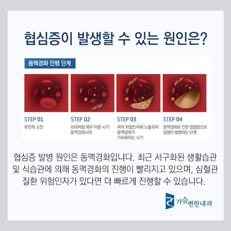 이 외에도 스트레스, 고지혈증 등도 협심증의 위험 인자로 작용합니다.