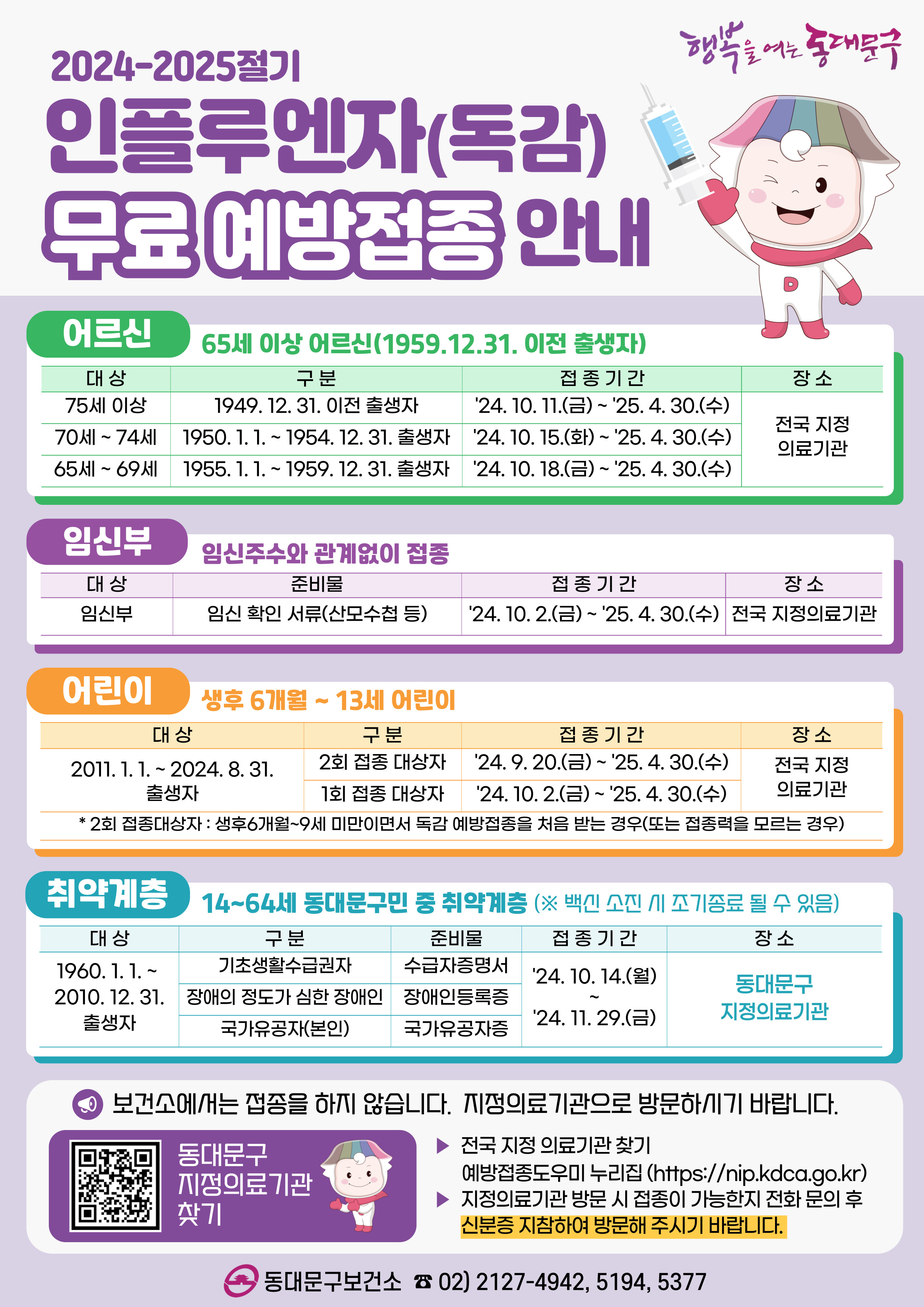 2024-2025절기 독감 예방접종은 건강을 지키기 위한 중요한 방법입니다. 접종 대상에 해당하시는 분들은 꼭 예방접종을 받으시길 권장드립니다. 추가적인 정보는 관악구청의 공식 웹사이트나 예방접종 도우미 사이트를 통해 확인하실 수 있습니다.