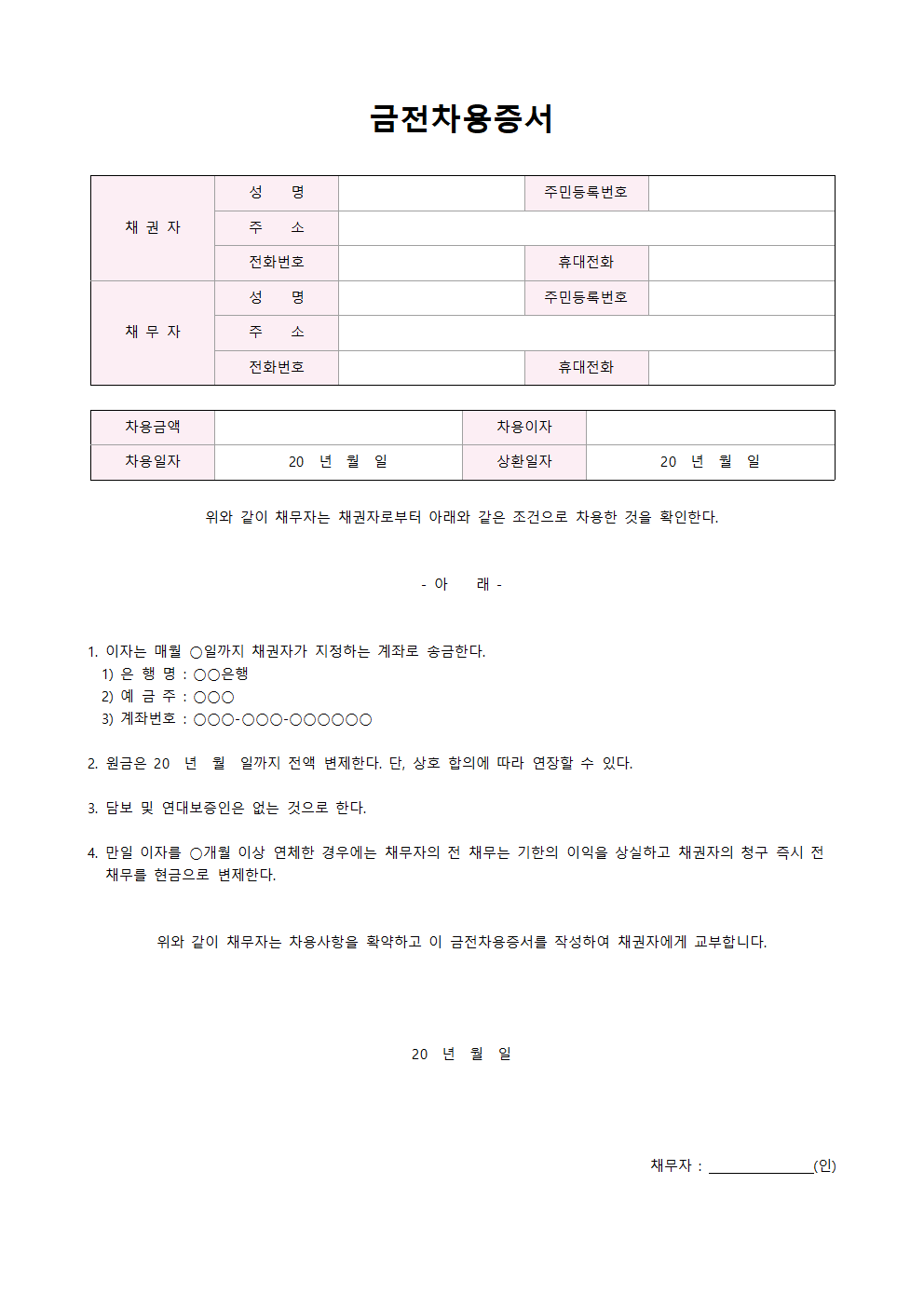 • 보관 : 차용증은 안전한 장소에 보관하여 분실하지 않도록 합니다.