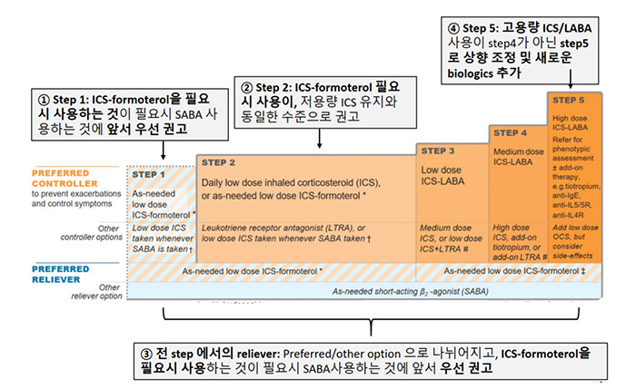 또한, GINA(세계천식연맹) 2020 가이드라인에 따르면, 천식 치료는 개인의 증상에 따라 단계적으로 조절해야 하며, 환자의 반응을 지속적으로 평가하고 조정하는 것이 중요합니다.