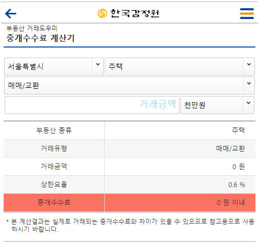 에서는 실제로 중개수수료를 계산할 수 있는 인터페이스를 보여줍니다.