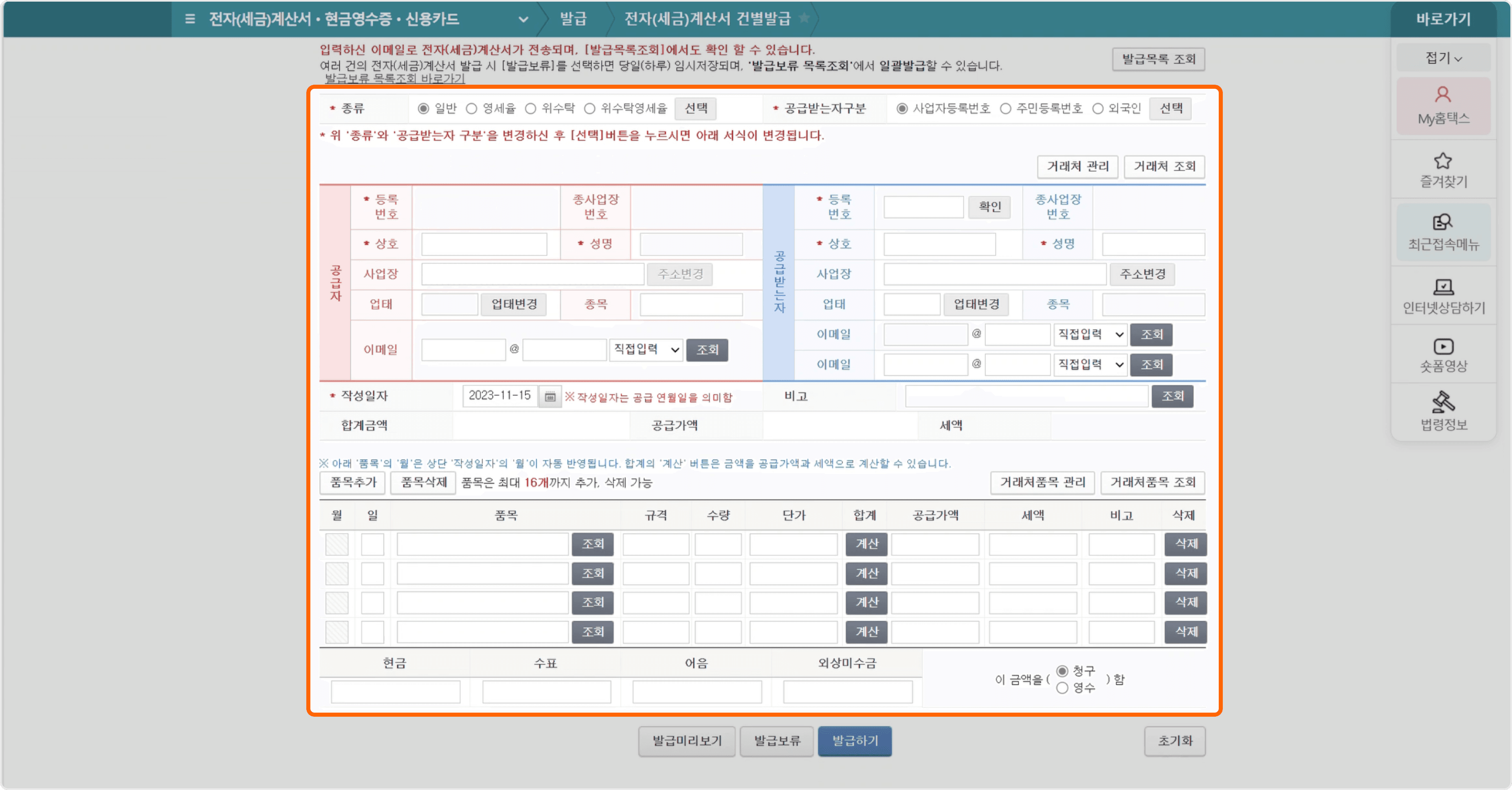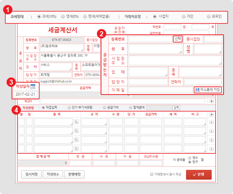 - 발행 완료 : 모든 정보를 입력한 후, '발행' 버튼을 클릭하면 전자세금계산서가 발행돼요.